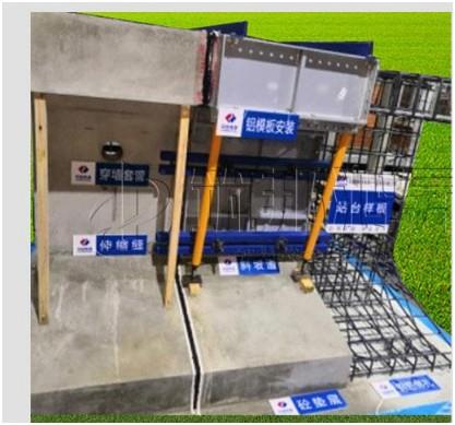 工藝展示:砼墊層,站臺墻帽,穿墻套管,鋁模板安裝,鋼筋綁扎,斜坡道,伸縮縫。